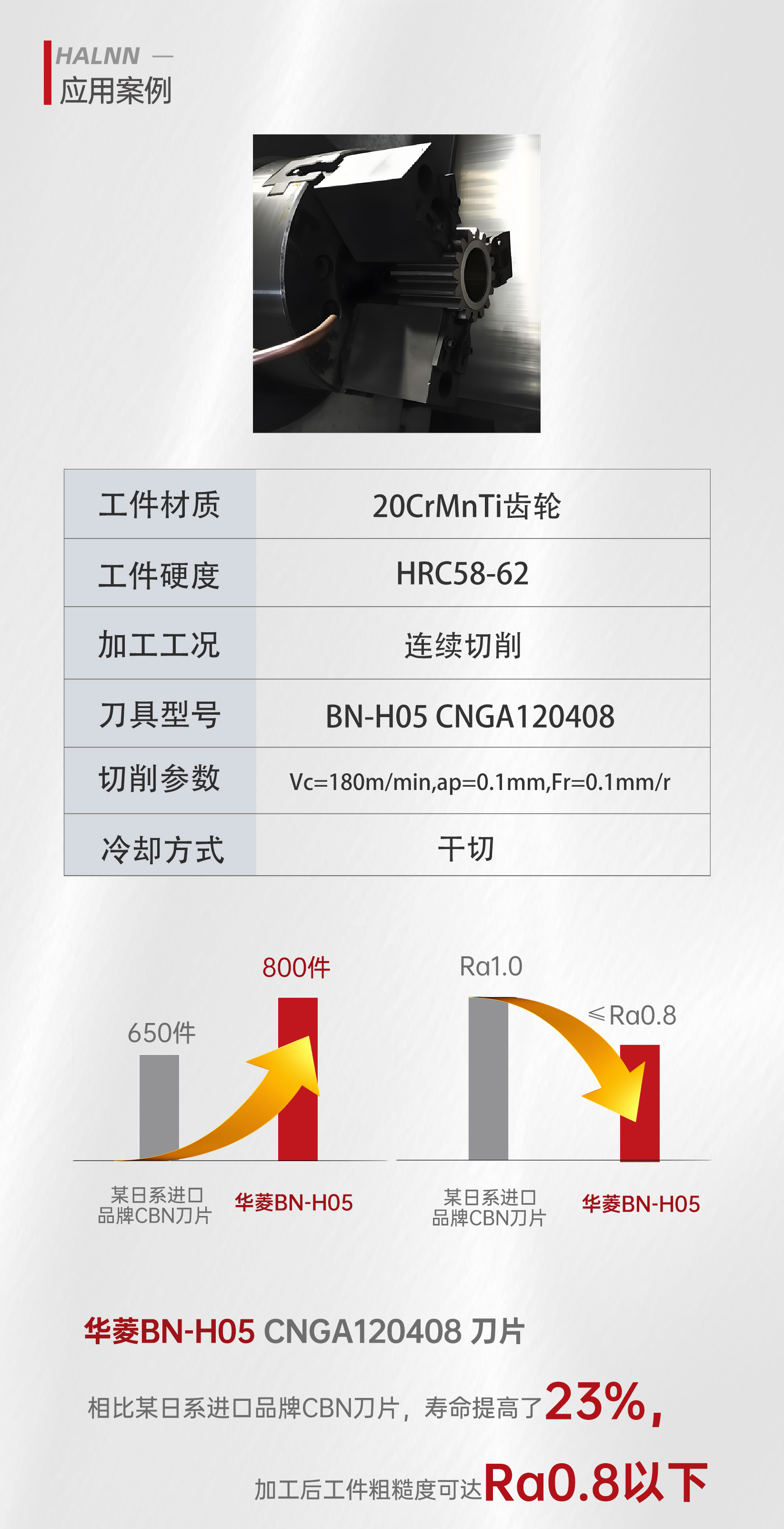 以20CrMnTi齒輪的連續(xù)切削為例,BN-H05系列CNGA120408刀具在HRC58-62的硬度下,展現(xiàn)了其卓越的性能。與某日系進(jìn)口品牌CBN刀片相比,華菱BN-H05系列刀片的使用壽命提高了23%,加工后的工件粗糙度更是達(dá)到了Ra0.8以下。